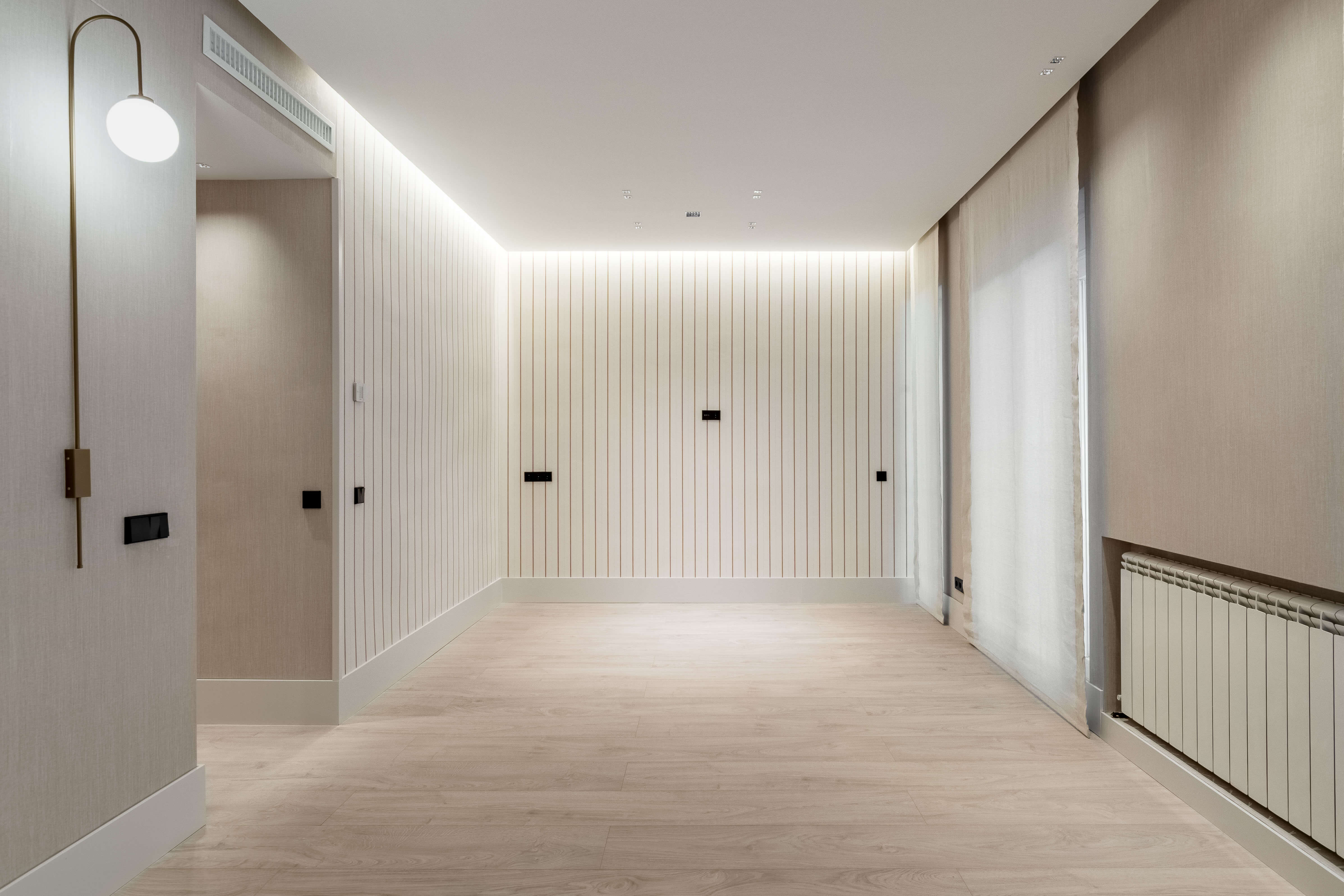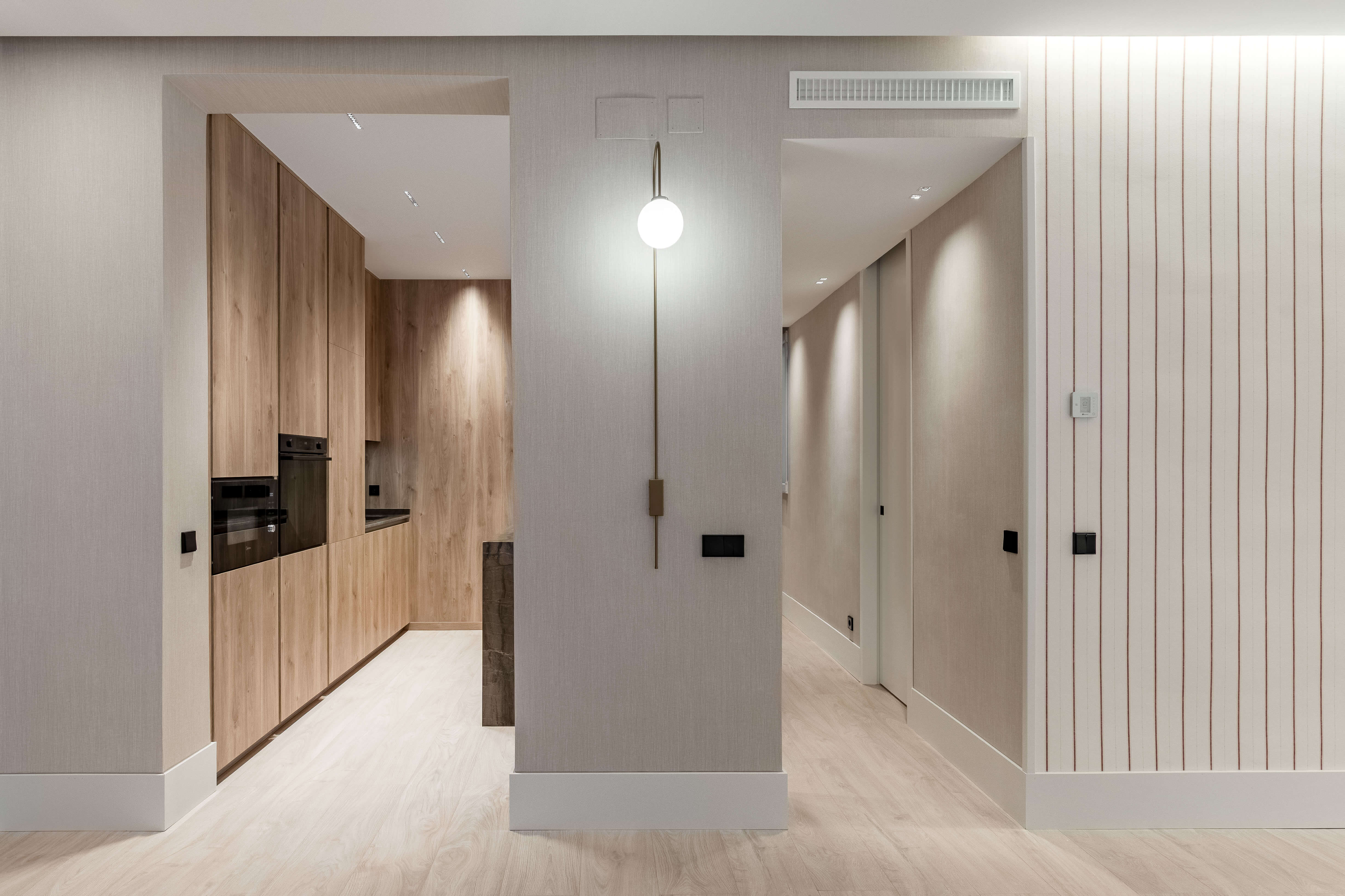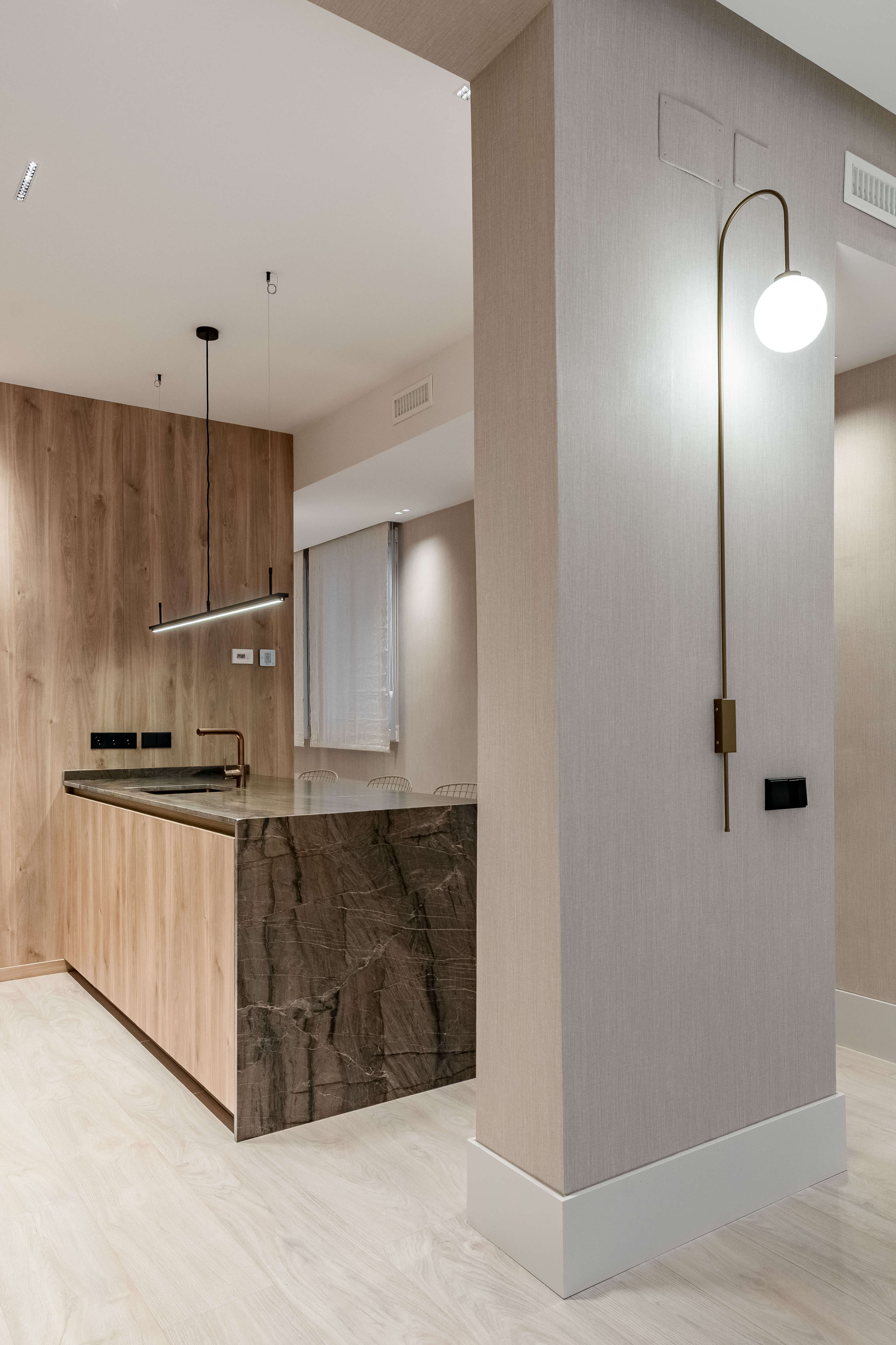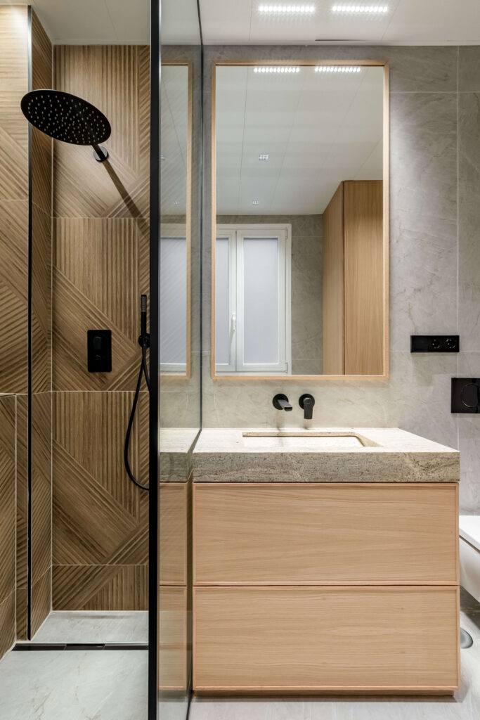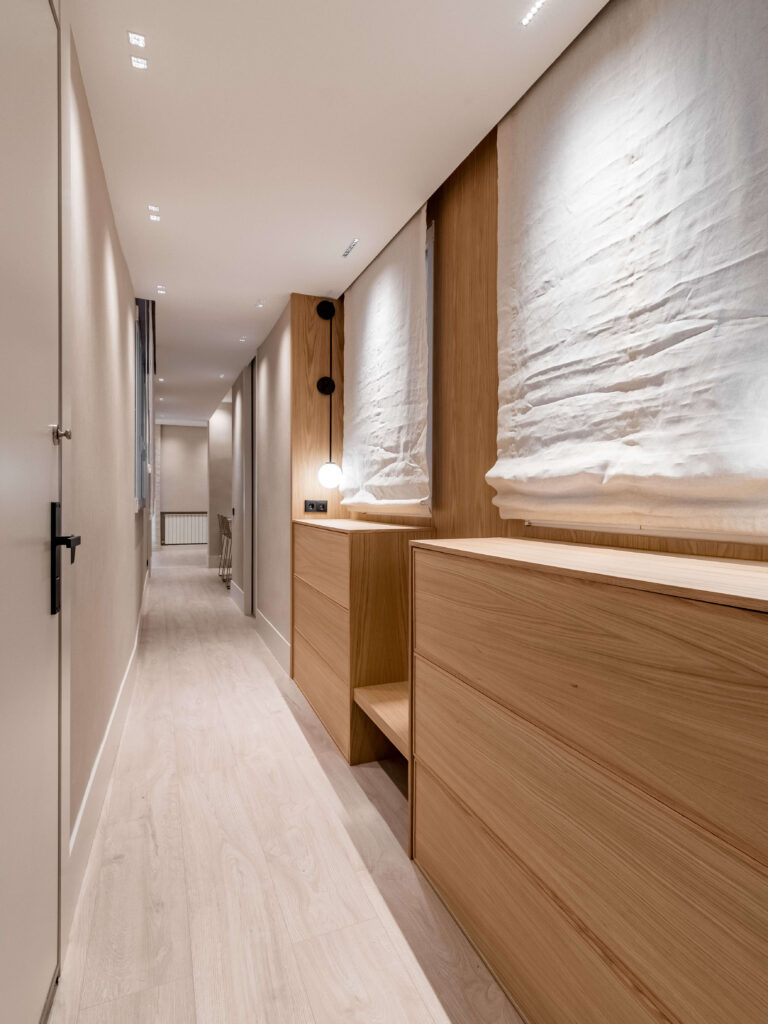 La cocina, con isla en piedra natural y mobiliario a medida, se integra perfectamente en el espacio, destacando por su iluminación lineal suspendida y una grifería en cobre cepillado. El proyecto apuesta por una estética limpia y atemporal, donde cada rincón ha sido optimizado con soluciones a medida. Baños con revestimientos geométricos, mobiliario suspendido y griferías negras aportan carácter y coherencia al conjunto. La iluminación indirecta, las texturas textiles y los tonos neutros completan un proyecto diseñado para potenciar la serenidad y la calidad de vida en el día a día.