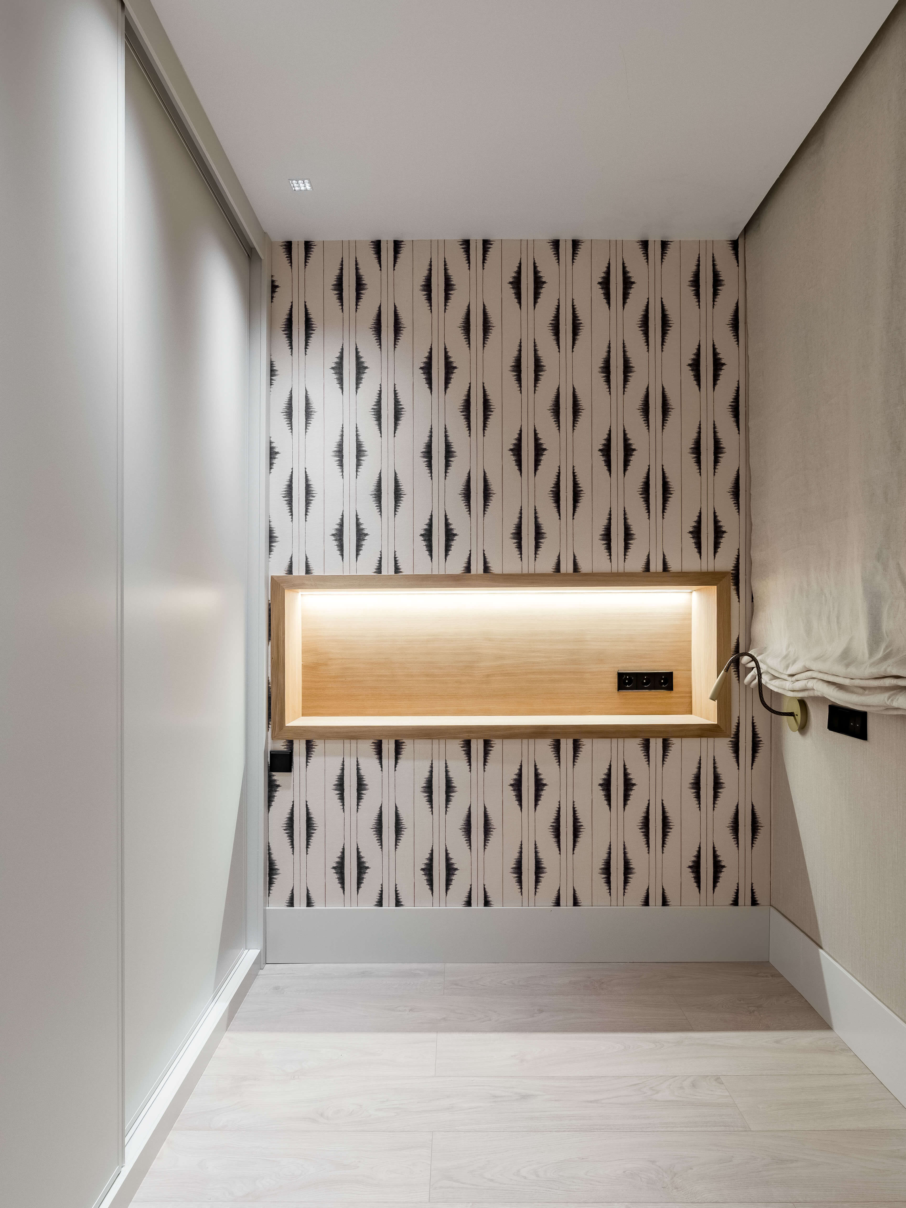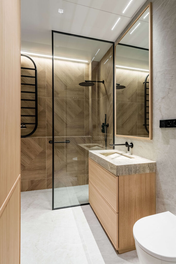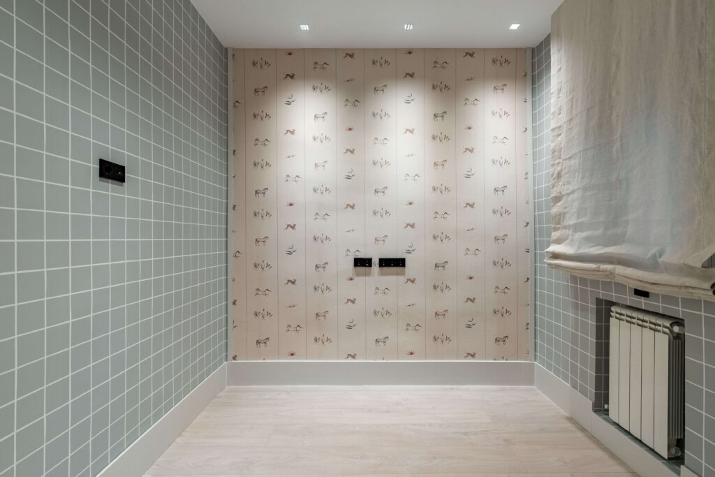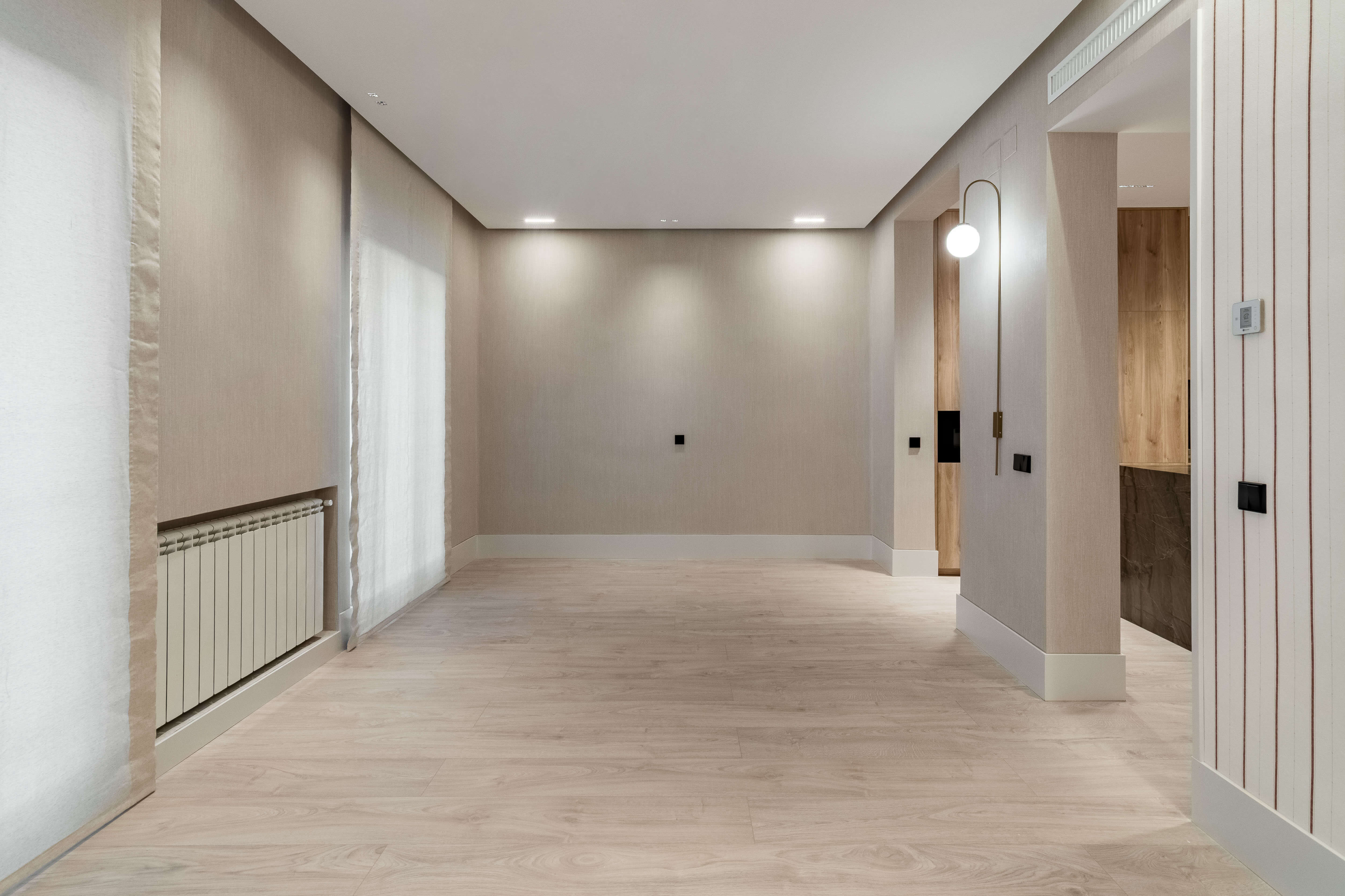 La cocina, con isla en piedra natural y mobiliario a medida, se integra perfectamente en el espacio, destacando por su iluminación lineal suspendida y una grifería en cobre cepillado. El proyecto apuesta por una estética limpia y atemporal, donde cada rincón ha sido optimizado con soluciones a medida. Baños con revestimientos geométricos, mobiliario suspendido y griferías negras aportan carácter y coherencia al conjunto. La iluminación indirecta, las texturas textiles y los tonos neutros completan un proyecto diseñado para potenciar la serenidad y la calidad de vida en el día a día.