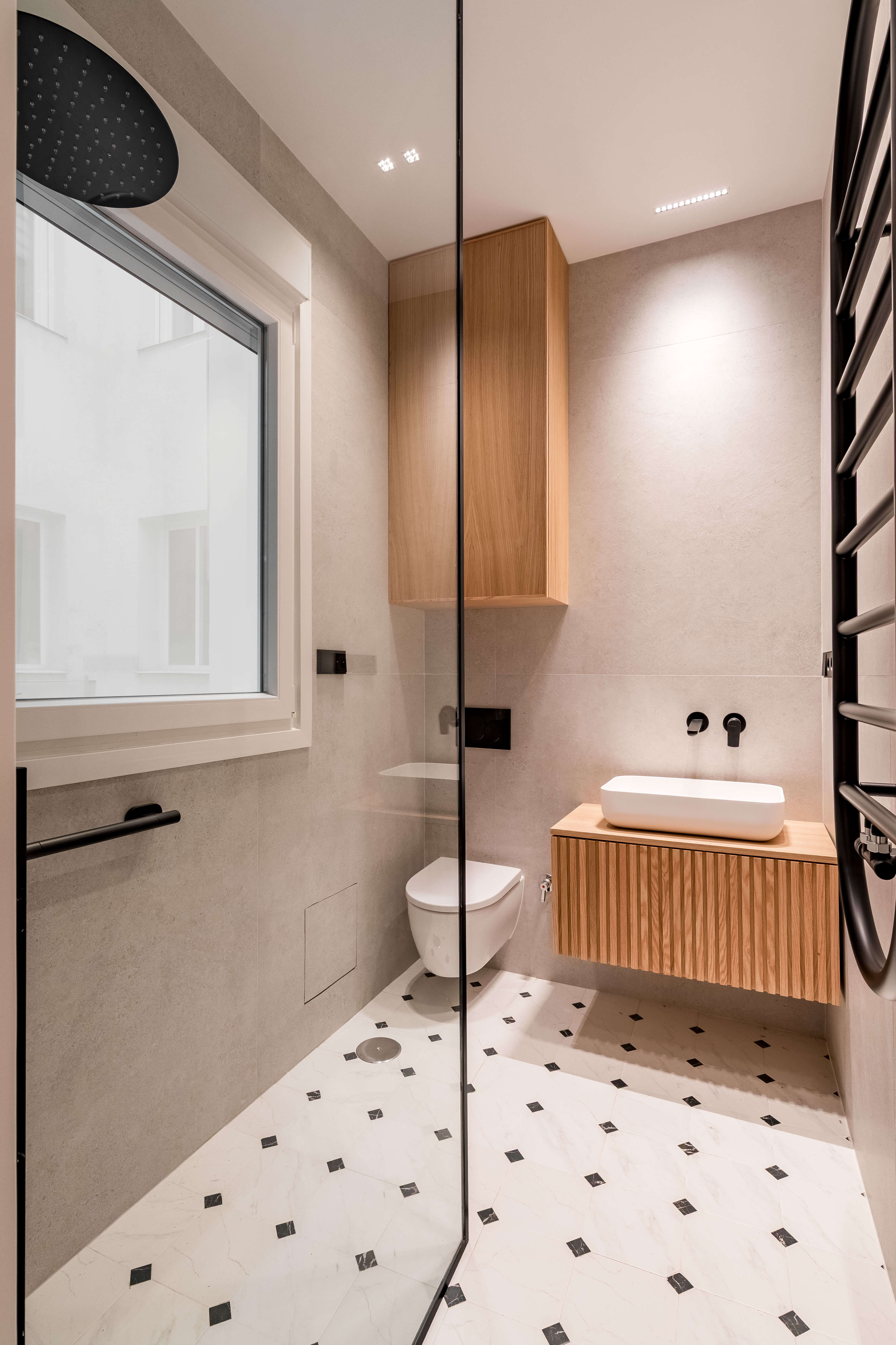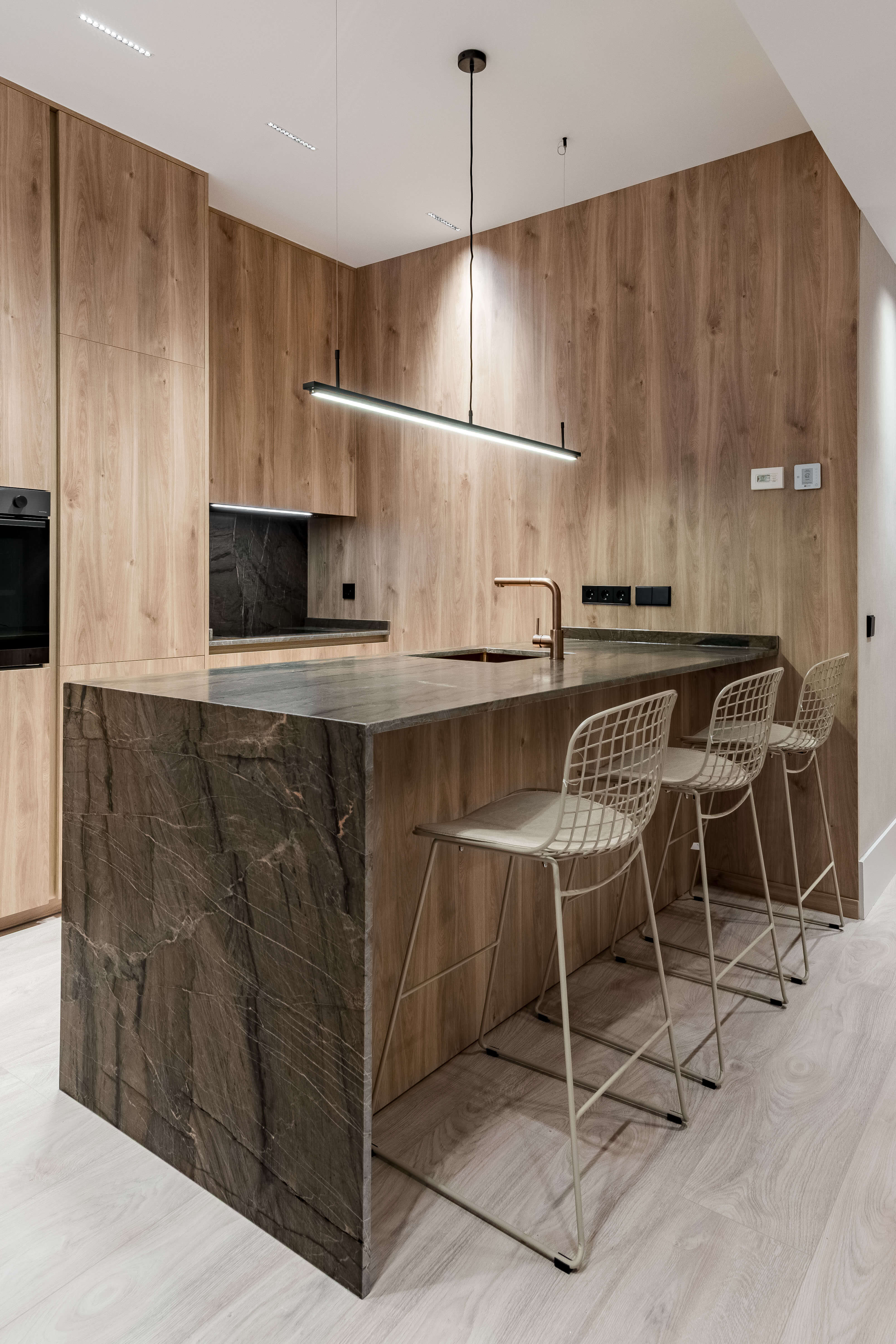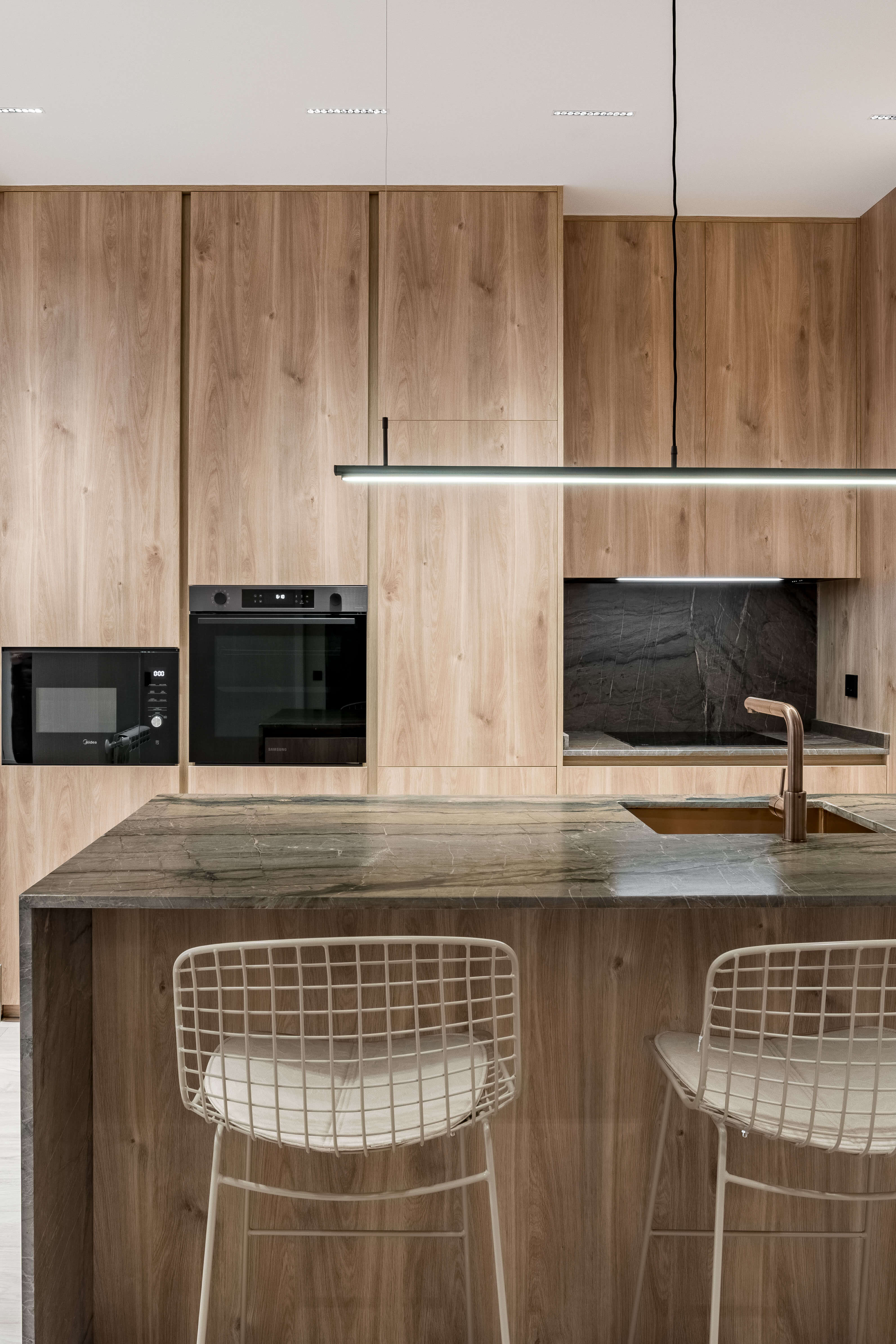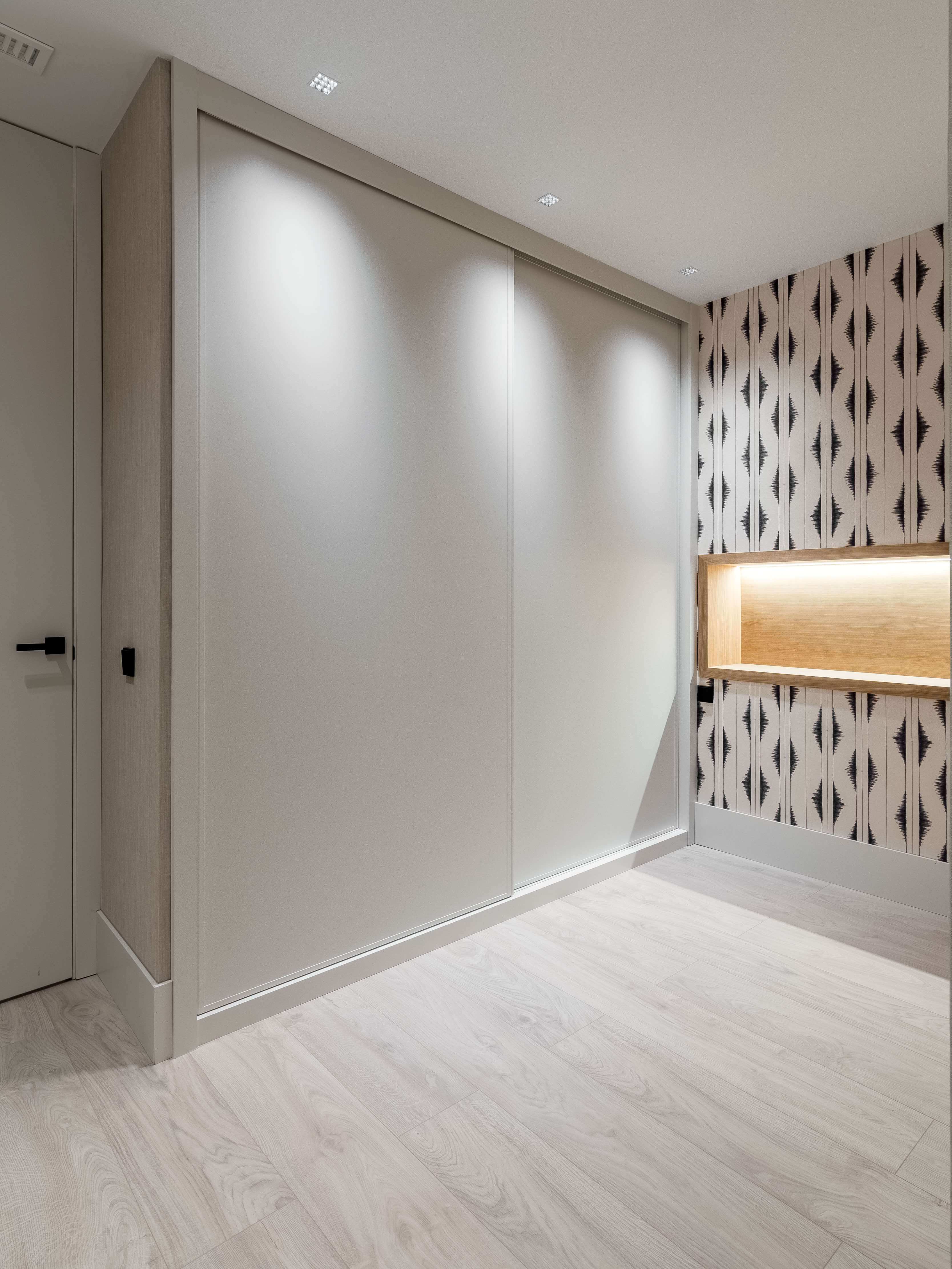 La cocina, con isla en piedra natural y mobiliario a medida, se integra perfectamente en el espacio, destacando por su iluminación lineal suspendida y una grifería en cobre cepillado. El proyecto apuesta por una estética limpia y atemporal, donde cada rincón ha sido optimizado con soluciones a medida. Baños con revestimientos geométricos, mobiliario suspendido y griferías negras aportan carácter y coherencia al conjunto. La iluminación indirecta, las texturas textiles y los tonos neutros completan un proyecto diseñado para potenciar la serenidad y la calidad de vida en el día a día.