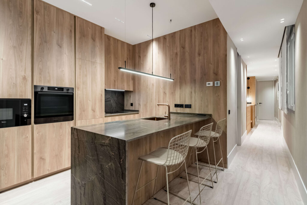 En este proyecto, el equipo de Lumasa Proyectos ha llevado a cabo una reforma integral en una vivienda situada en la calle Doctor Esquerdo, Madrid, con el objetivo de crear un entorno funcional y elegante. La propuesta de diseño combina la calidez de la madera natural con materiales de gran presencia como la piedra veteada, logrando un equilibrio entre sobriedad y sofisticación.